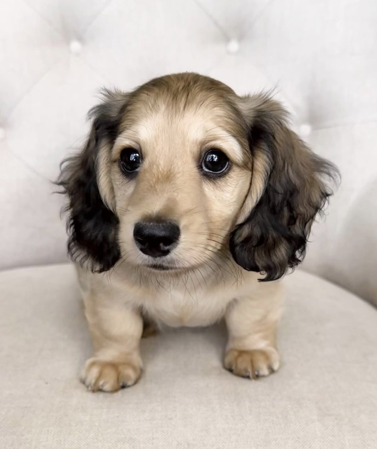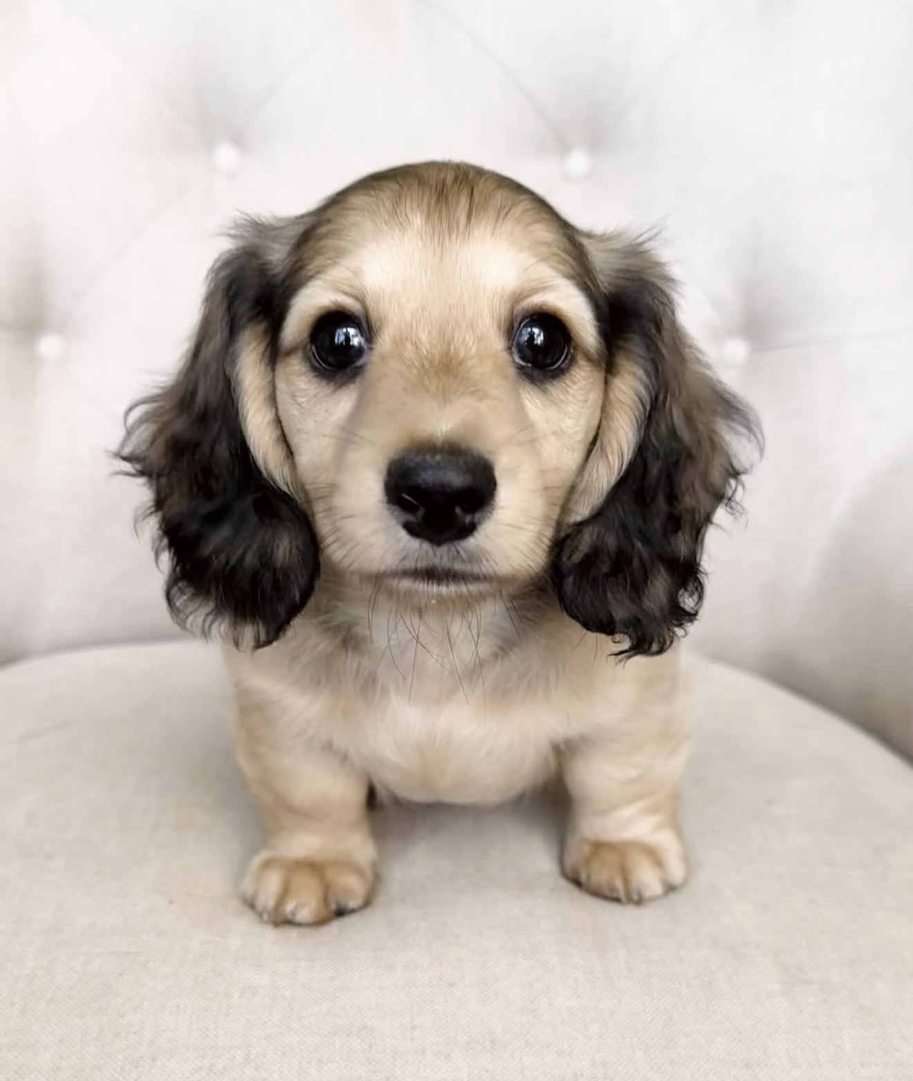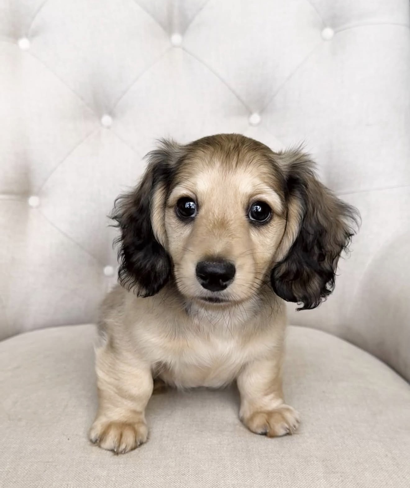 Nomi’s cream fur and dark, velvety ears give her a look that’s as charming as her personality. She’s gentle but full of curiosity, always ready to explore or tilt her head when you call her name. Whether she’s sitting pretty or bouncing toward you with that happy little trot, Nomi brings warmth and sunshine into every moment.
