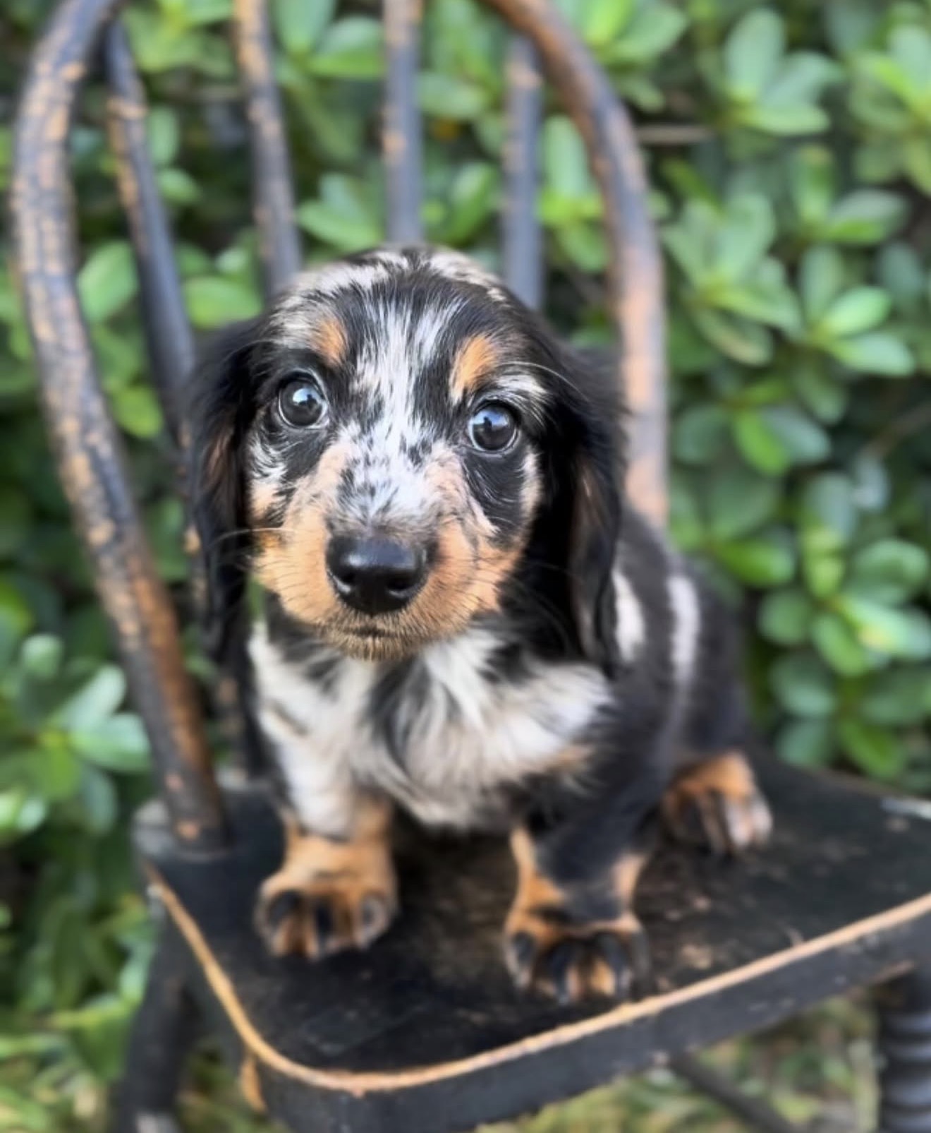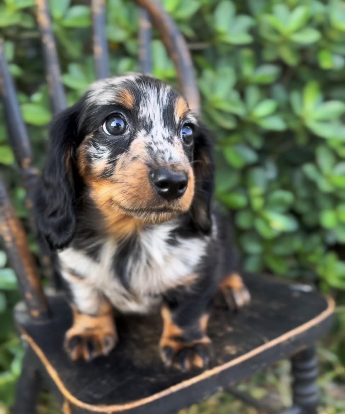 With his striking merle coat and those curious, intelligent eyes, Rulo stands out the moment you see him. He’s playful, adventurous, and loves discovering new things whether it’s chasing a leaf or climbing onto a cozy chair for a better view. Rulo has a confident spirit and a loving heart, the perfect mix for anyone looking for a fun, loyal companion.